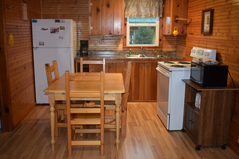 All cabins are comfortably furnished, blankets and pillows are provided, weekly guests should bring sheets and towels. Kitchens include fully equipped electric stove, refrigerator with freezer, microwave oven, coffee pot, toaster, dishes and cooking utensils.